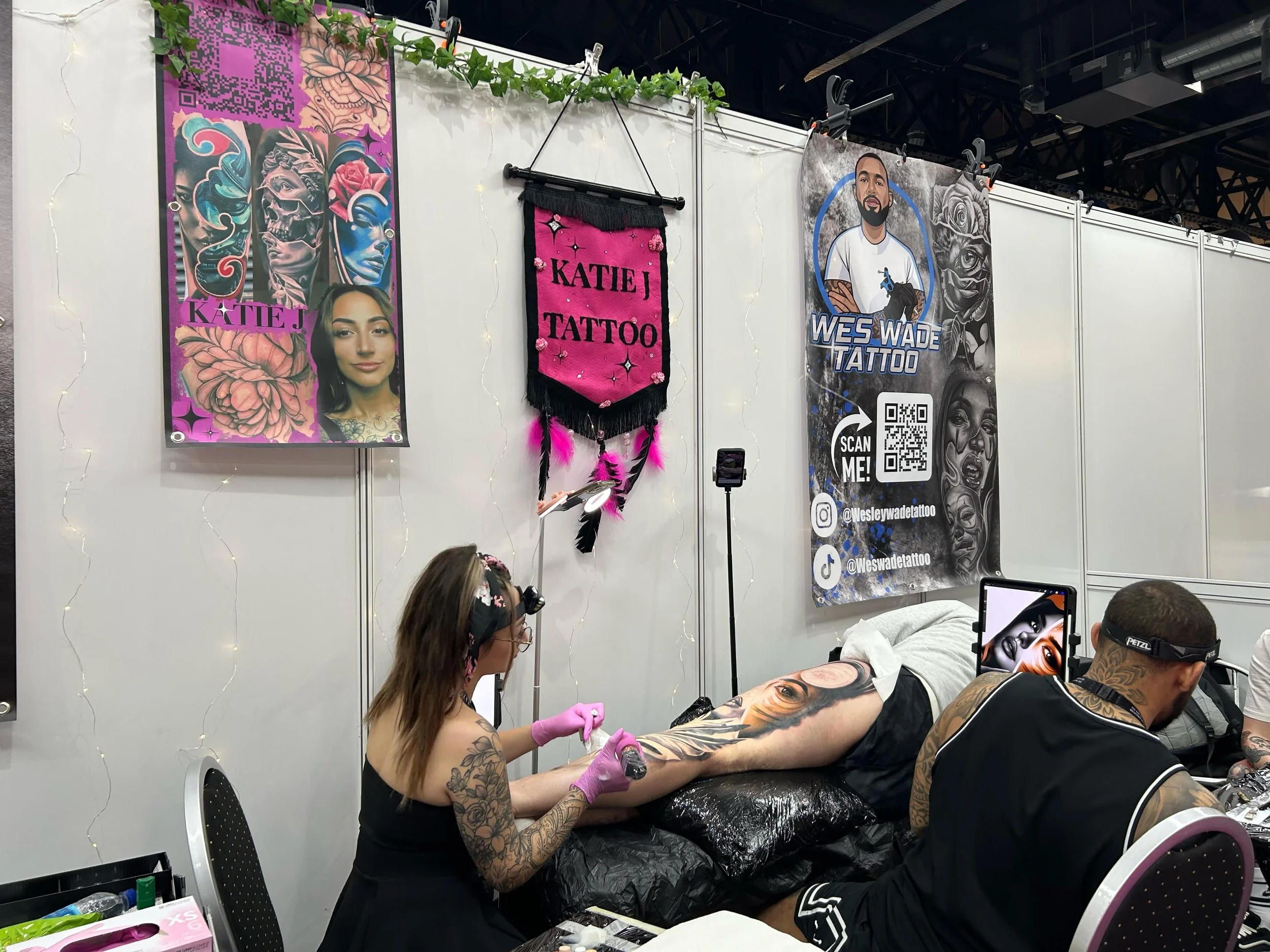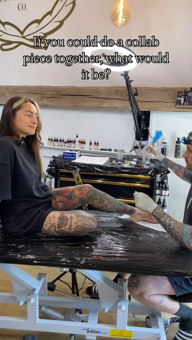 Working side by side, the two artists collaborated on a single piece that showcased both of their signature styles. Katie brought her vibrant Colour Realism to life, adding rich tones and eye-catching detail, while Wes balanced the composition with his smooth and striking Black and Grey Realism. The result was a seamless fusion of colour and monochrome – each style enhancing the other and making the final piece truly unique.